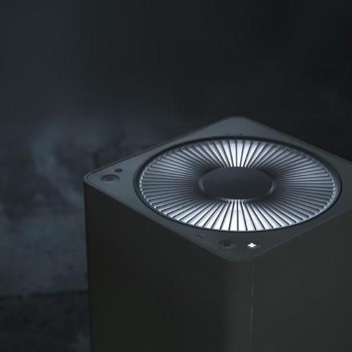 空気清浄の強さと共に、明るさが変化するBALMUDA The Pure の流路。本体は極力シンプルに。そして光をデザインの一部に取り込みました。光の柱を通ることで、部屋の空気は清浄されていきます。部屋が暗くなると、それに合わせて、光も暗くなります。
