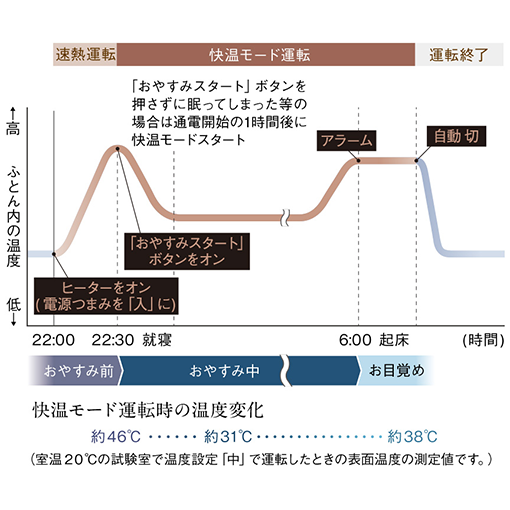 ●おやすみから起床まで、自動で温度をコントロールする快温モード搭載。