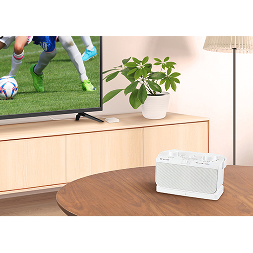 本機は、充電台と送信器が分かれているため、充電台をお好みの場所へ設置でき、充電の際に受信機本体(スピーカー)を、テレビ周りに戻す手間がありません。