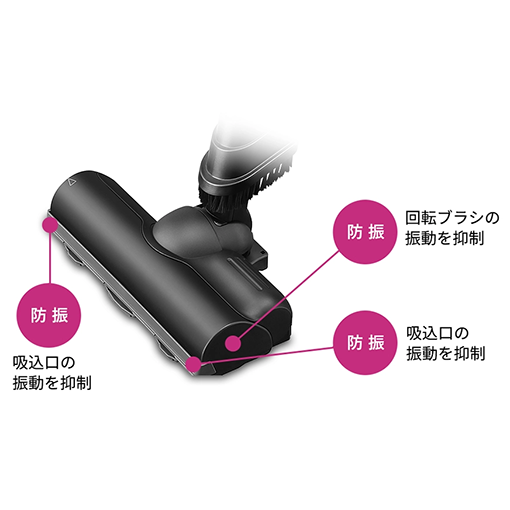 独自の低騒音化技術により、低騒音化技術非搭載機種と比べ、実感音(SONE値)を約17%低減しました。また、運転時に不快に感じる耳障りな音(ピーク音)の抑制により、周りも時間も気にせず、お掃除することができます。