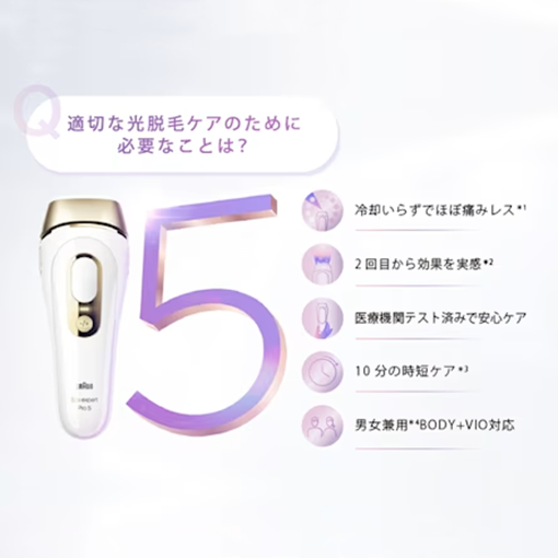 家庭用の脱毛器やシェーバーなどで有名なブラウンのプレミアム光美容器 Pro5。効果とやさしさを両立しつつ、脱毛後のムダ毛や残り毛が気になる方へ、「ツルスベ美肌を叶える、あんしん5 in 1ムダ毛ケア」を実現。