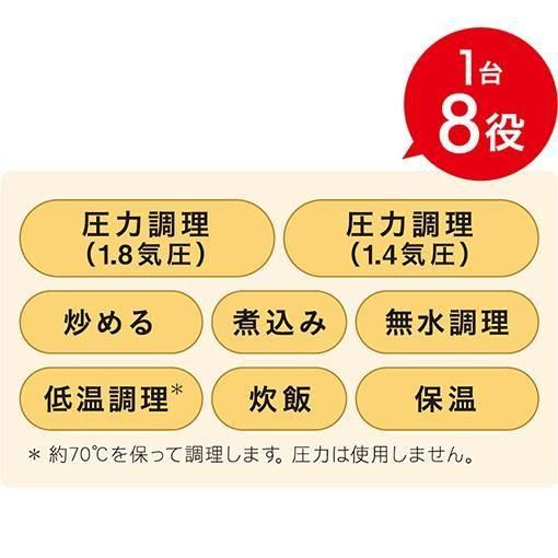 圧力調理や炒める、無水調理、煮込み、無水調理、低温調理、炊飯、保温まで。