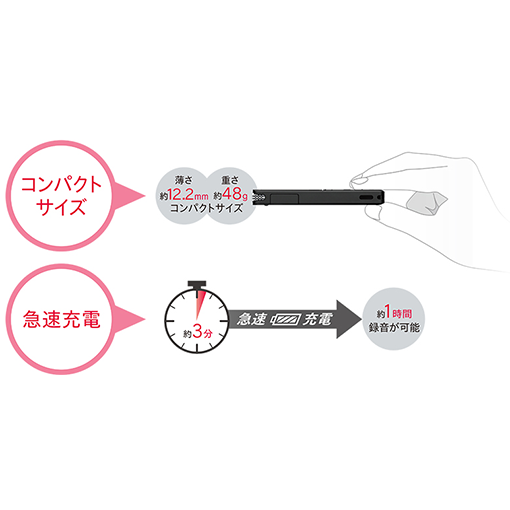 薄さ約12.2mm、重さ約48gのコンパクトなボディは持ち歩きにも便利。約3分の充電で約1時間の録音ができる「急速充電」にも対応しているので、急な会議などの際もすぐに使えます。