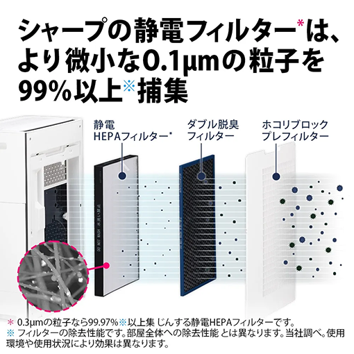 静電HEPAフィルターとダブル脱臭フィルター、さらに抗菌・防カビホコリブロックプレフィルターで、さまざまな空気の汚れをしっかりとキャッチします。