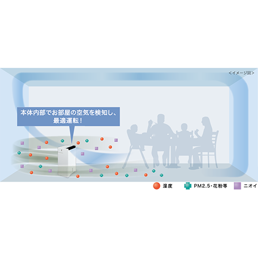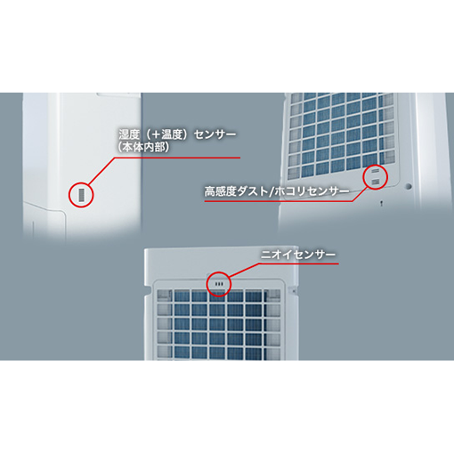 多彩なセンサーでお部屋の空気の状態をモニタリング。湿度(+温度)センサーがお部屋の湿度と温度を、ニオイセンサーが様々な生活臭を、高感度ダスト/ホコリセンサーがPM2.5、PM1.0、花粉などの汚れを自動でセンシング。