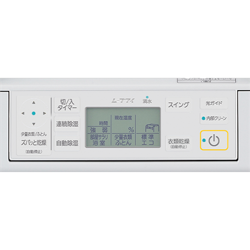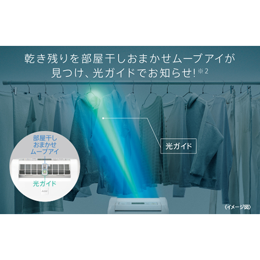 部屋干しおまかせムーブアイ(赤外線センサー)が検知した、乾き残りを「光ガイド」でお知らせ(OFFも可)。ピンポイント送風で徹底乾燥します。