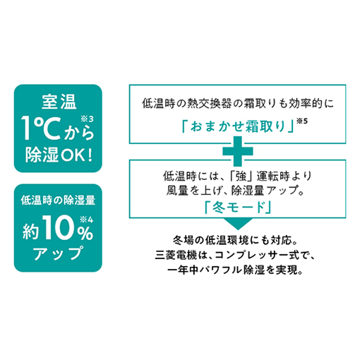 ■三菱電機なら「おまかせ霜取り」で冬でも使える!室温1℃からしっかり除湿可能
