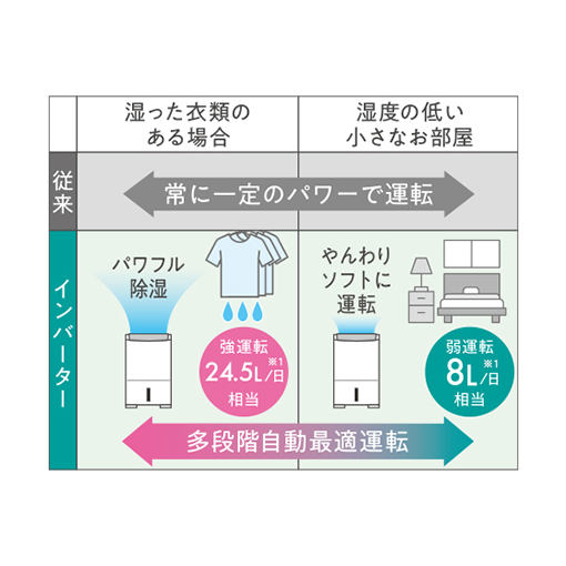 ½¾ÍèÀ©¸æ¤Ï¡¢¾ï¤Ë100¡ó¤ÎǽÎϤDZ¿Å¾¡£¤½¤ì¤ËÂФ·¡¢¥¤¥ó¥Ð¡¼¥¿¡¼À©¸æ¤Ï¡¢¼¾Å٤˱þ¤¸¤Æ¥Ñ¥ï¡¼¤ò¼«Æ°¤Ç¥³¥ó¥È¥í¡¼¥ë¡£¥à¥À¤Î¤Ê¤¤¾Ê¥¨¥Í½ü¼¾¤ò²Äǽ¤Ë¤·¤Þ¤¹¡£